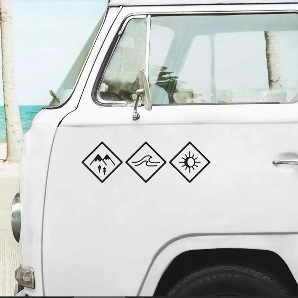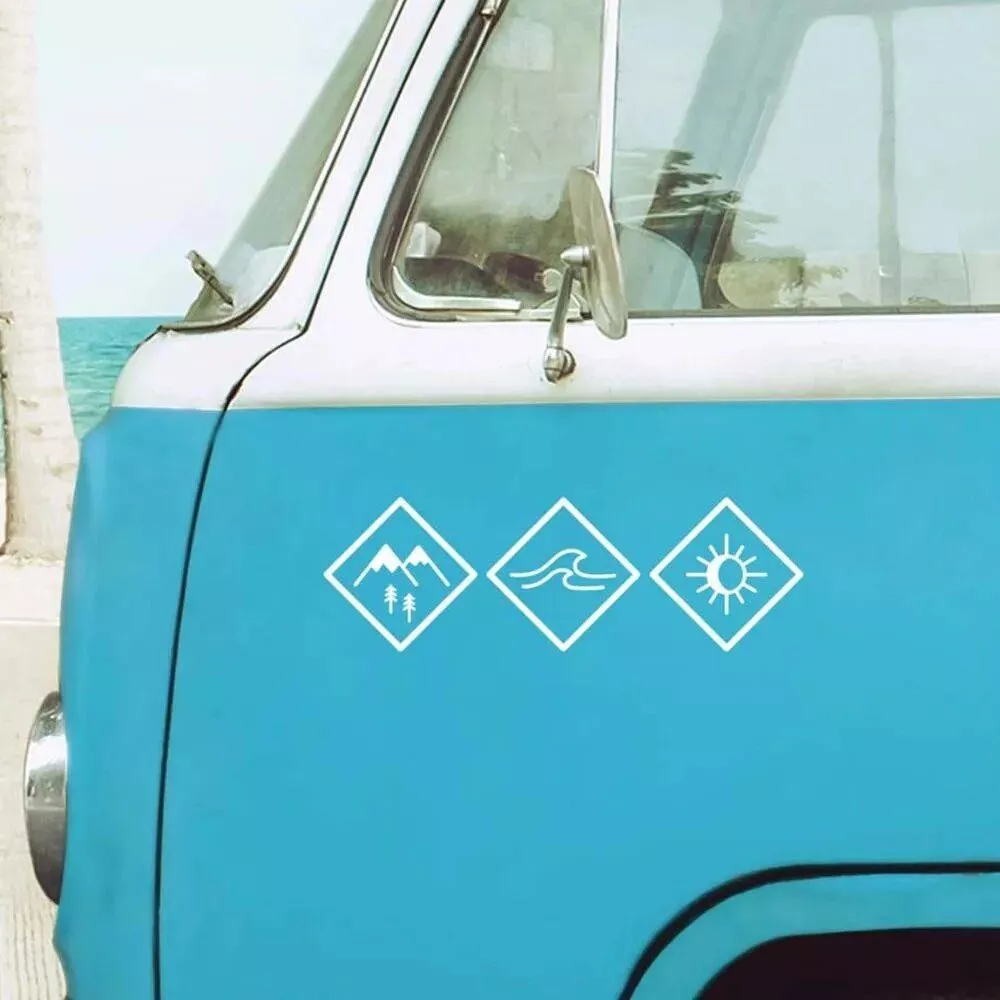 For the free-spirited road warrior and the nature lover alike, our 3-piece decal set brings the essence of the great outdoors right to your vehicle. Whether you’re cruising in your motorhome, truck, or van, these adhesives add a personalized touch of the wilderness with stylish waves, majestic mountains, and serene forest scenes. Our decals aren’t just decorations; they’re emblems of your adventurous spirit.