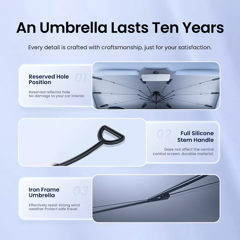 Its sleek, modern look pairs perfectly with your Tesla’s design, while the durable materials ensure that it can withstand long-term use. The foldable design makes it easy to store and carry, and the silicone umbrella top guarantees no damage to your windows during use. Whether you’re looking for a way to maintain your car’s comfort or simply want to preserve its interior from UV damage, this sunshade is your perfect solution.