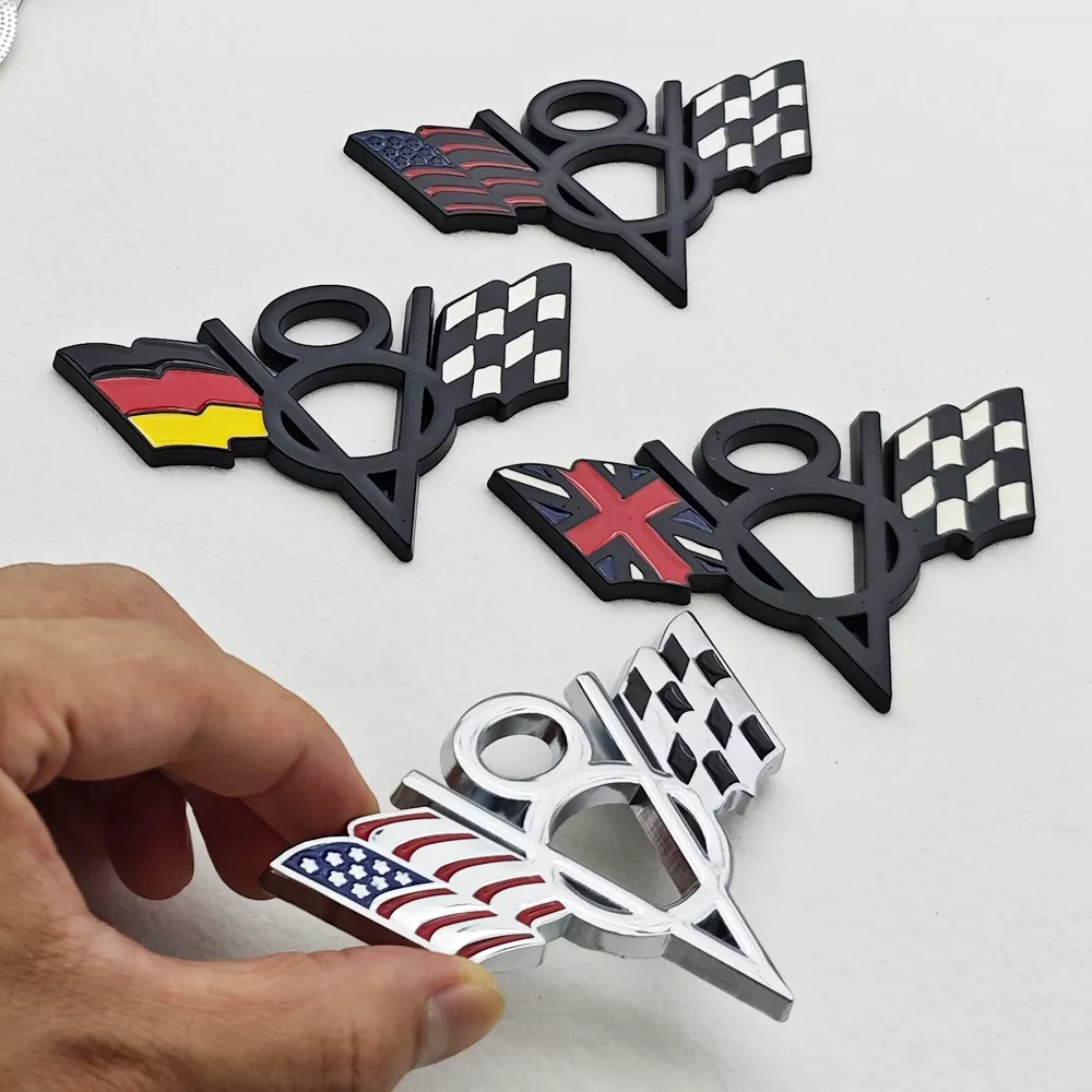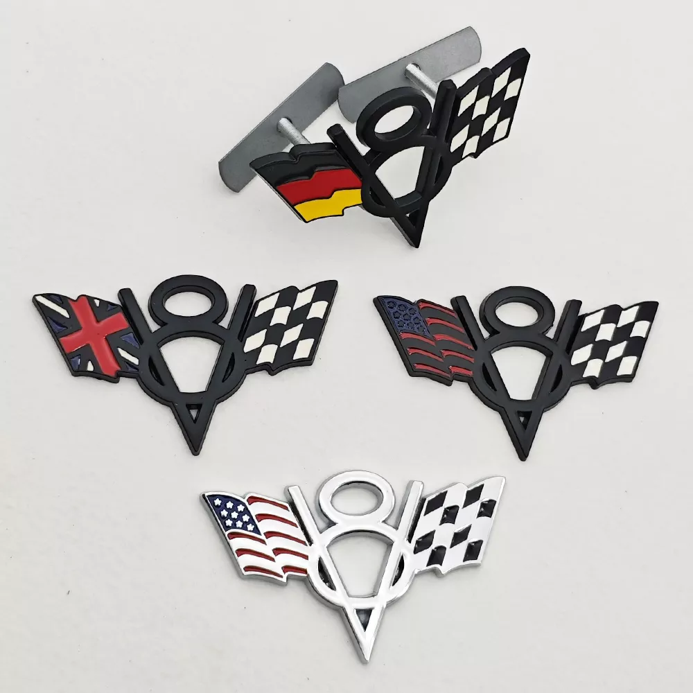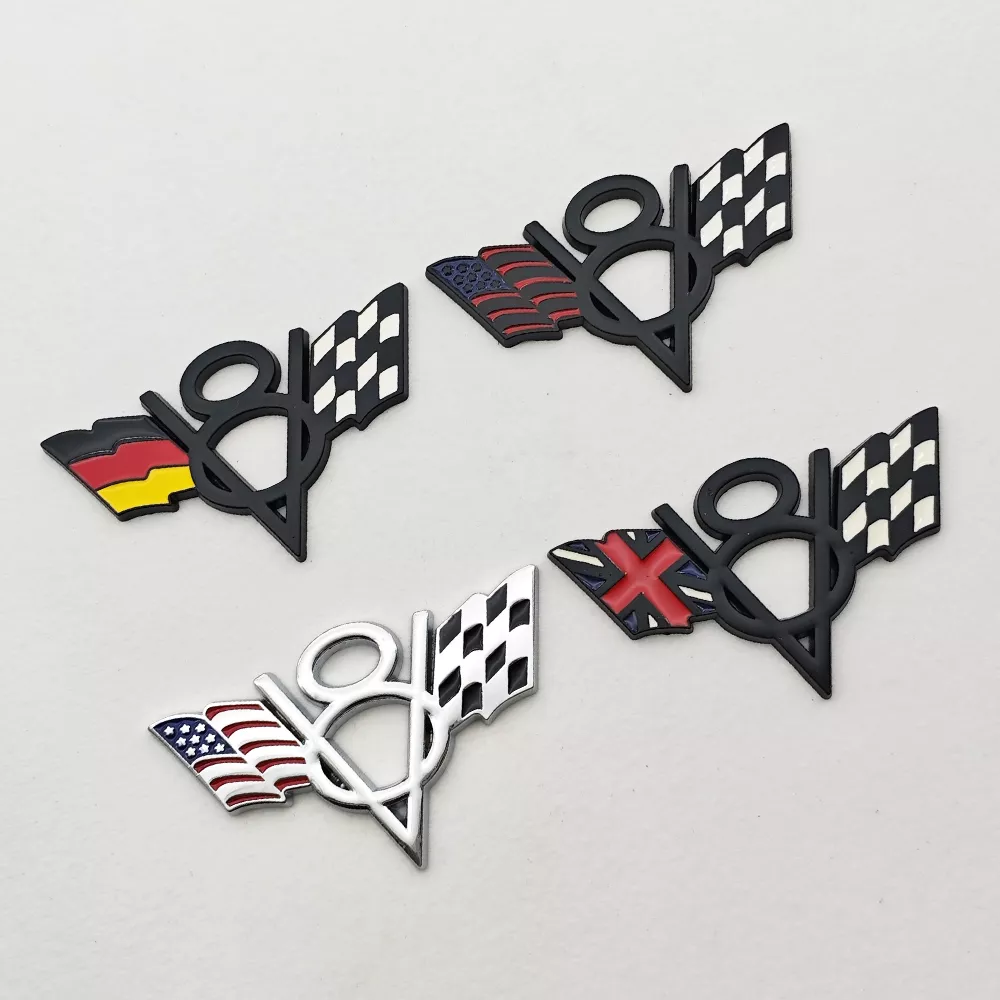 • Design: 3D V8 emblem featuring the flags of the US, UK, and Germany for a unique and stylish look.